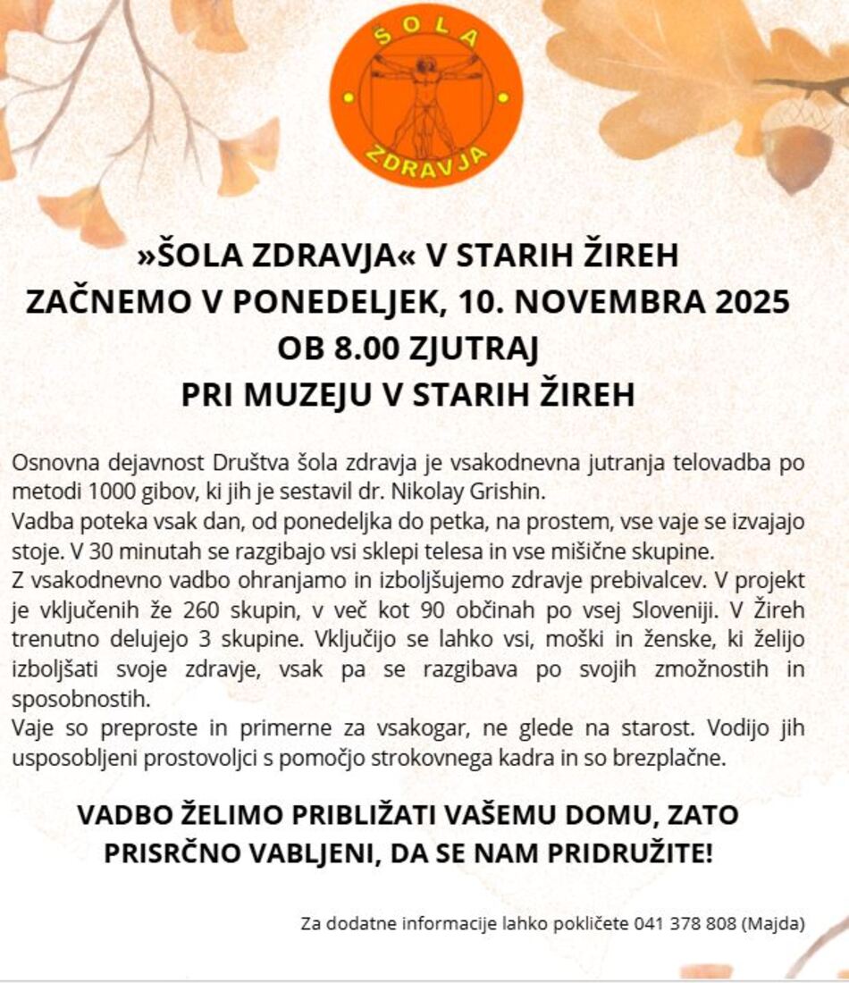V ponedeljek 10. 11. pričenja z vadbo nova, četrta skupina Šole zdravja Žiri, ki jo bo vodila prostovoljka in voditeljica Majda Dragovan. Vadba bo potekala vsak dan zjutraj ob 8h pred muzejem v Starih Žireh.