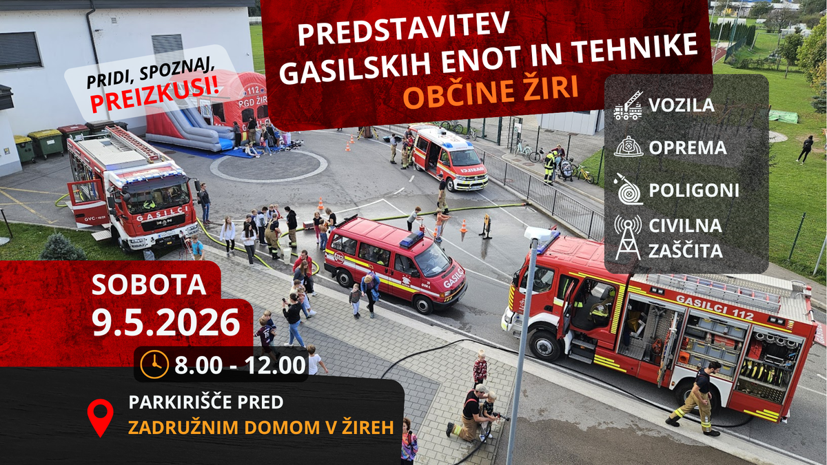 V soboto, 9. maja 2026, med 8.00 in 12.00 bo na parkirišču pred Zadružnim domom v Žireh potekala predstavitev gasilskih enot in njihove opreme.