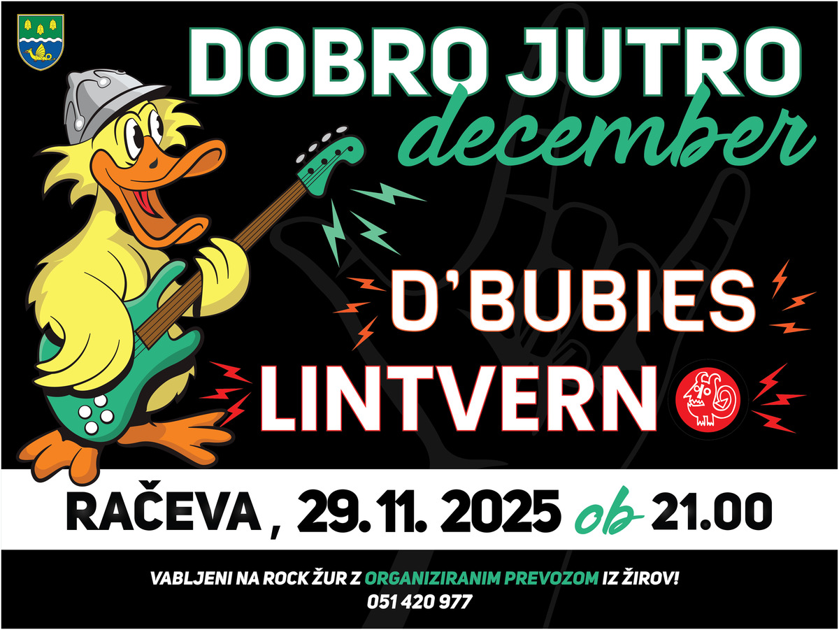 PGD Račeva prireja 29. novembra 2025 v Račevi žur s skupino D’BUBIES in legendarno žirovsko skupino LINTVERN. Poskrbljeno bo za dobro glasbo, pijačo in prigrizek. Urejen bo prevoz udeležencev na relaciji Račeva-Žiri ( tel.: 051 420 977), tako da se bomo lahko vsi brez skrbi prebudili v novo jutro veselega decembra.