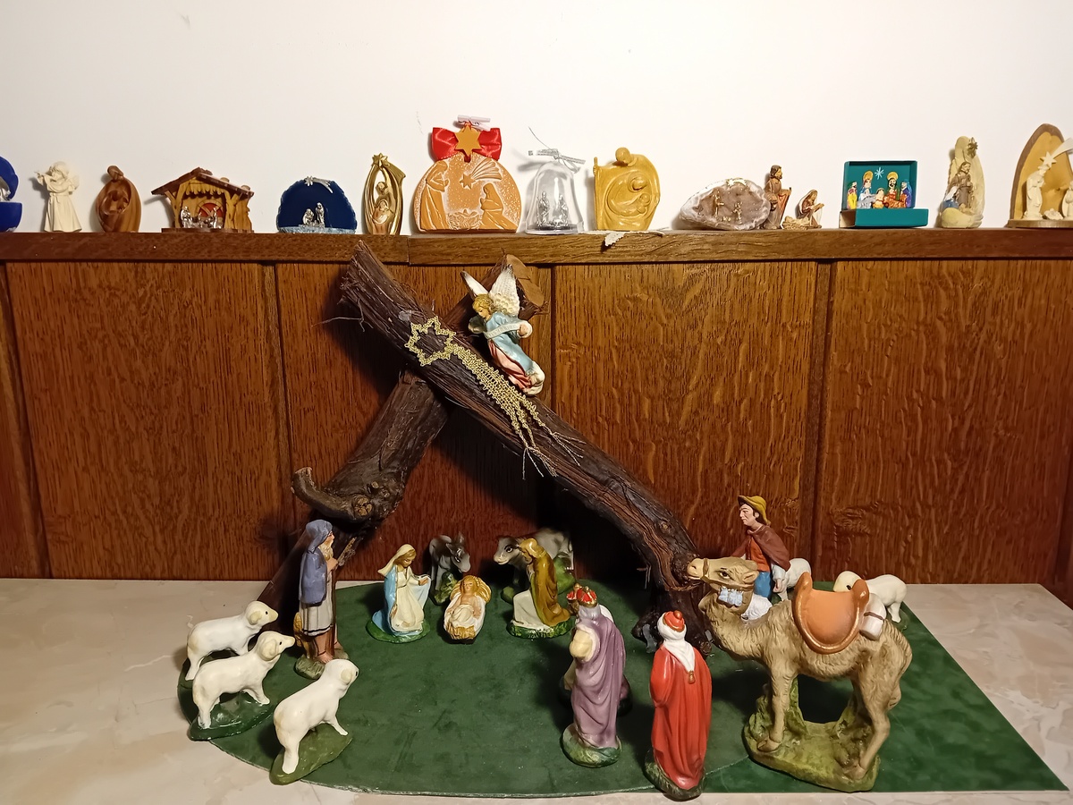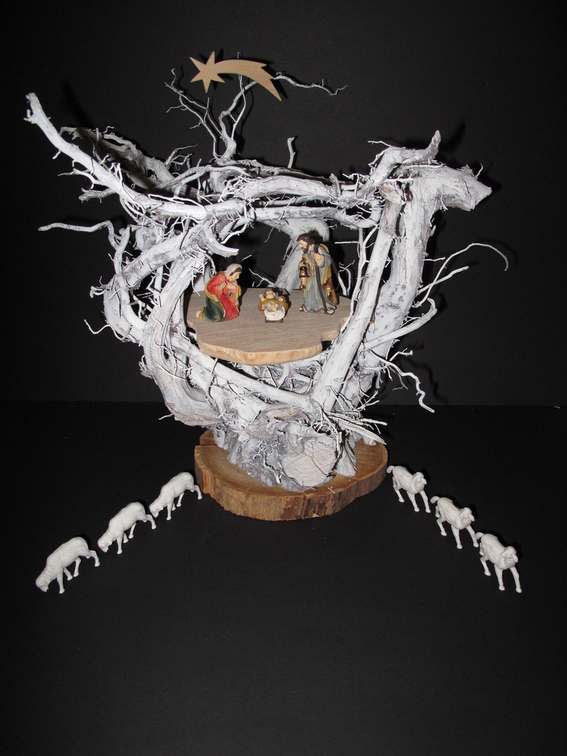 ROBERT ŽAKELJ jaslične figure postavi na ročno obdelane korenine ali veje ki jih nabere pri drvarjenju ali na dopustu ob morju, kjer najde kakšen zanimiv kos naplavljenega lesa. Tako vsako leto doma postavi drugačne jaslice in troje med njimi je tudi razstavil, ene pa je naredil prav za razstavo.