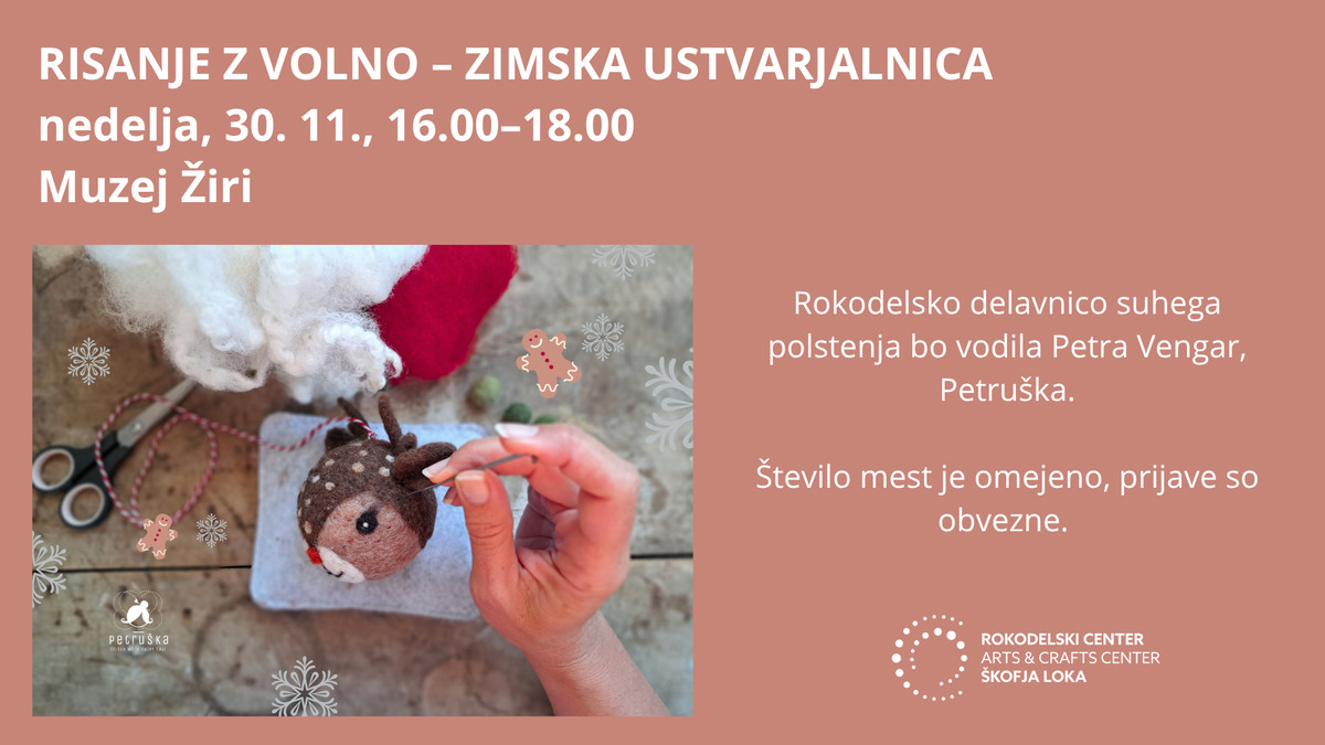 Na delavnici se bomo naučili posebne tehnike risanja z volno, kjer volnene niti postanejo naše barve, s katerimi ustvarjamo nežne slike in oblike. Spoznali bomo, kako z volno rišemo po mehki podlagi iz filca in kako lahko z istim pristopom ustvarimo tudi trodimenzionalne volnene oblike – zimske krogle, zvezdice ali drobne okraske za smrečico.